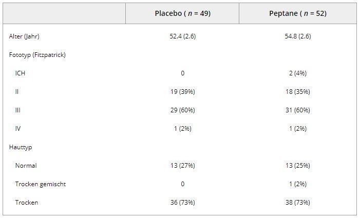 Um einen erweiterten Einblick in die Wirksamkeit von Peptan® zur Verbesserung der Hautalterungsparameter zu erhalten, führten wir eine randomisierte, placebokontrollierte Doppelblindstudie durch. Einhundertsechs Frauen wurden auf ihre Eignung hin gescreent und nach dem Zufallsprinzip zugeteilt, um 10g Placebo (n = 52) oder Peptan® (n = 54) pro Tag als aromatisiertes Pulvergetränk über einen Zeitraum von 12 Wochen einzunehmen. 101 Teilnehmer beendeten die Studie gemäß dem Protokoll, wobei 18 Probanden (Placebo n = 7, Peptan® n = 11) geringfügige Abweichungen vom Protokoll bezüglich der Produktverabreichung aufwiesen (Abb. 3). Es wurden keine unerwünschten Ereignisse gemeldet. Drei Probanden wurden aus der Placebogruppe genommen, zwei auf eigenen Wunsch und einer wegen Nichteinhaltung. Zwei Probanden gingen für die Nachbeobachtung aus der Peptan®-Gruppe verloren. Daten der konfokalen Reflexionsmikroskopie zur Kollagenfragmentierung waren für eine Person in jeder Gruppe nicht auswertbar. Daher werden nachstehend die Ergebnisse von 48 Probanden der Placebo-Gruppe und von 51 Probanden der Peptan®-Gruppe präsentiert. Wie in Tabelle 1 gezeigt, gab es zu Studienbeginn keine Unterschiede zwischen den beiden Gruppen hinsichtlich Alter, Lichtbildverteilung sowie Hauttyp.